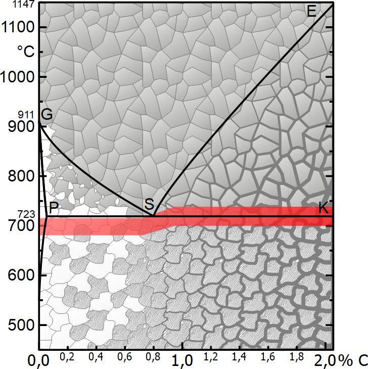 在软化退火过程中,亚共析钢被刚好加热到PS线以下,这样渗碳体就不会分解。层状渗碳体现在有足够的时间通过扩散过程转变成热力学上更有利的圆形。珠光体中的条状渗碳体转变为球状渗碳体。渗碳体分解成圆形后,钢慢慢冷却。与亚共析钢相比,过共析钢在软化退火过程中加热,温度略高于或围绕PSK线振荡。