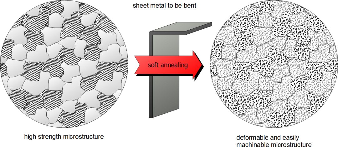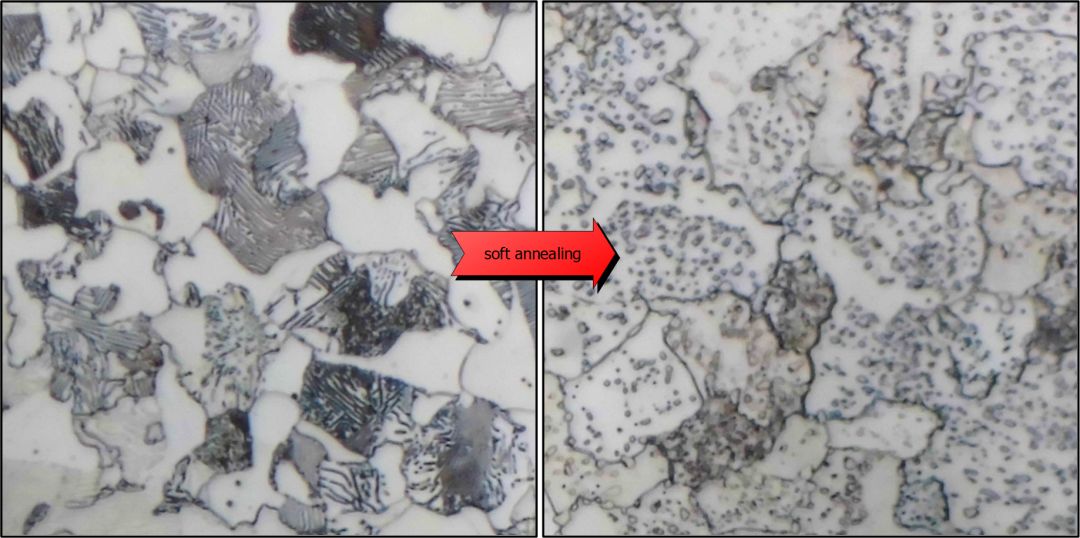 经软化退火处理后,由于球状渗碳体的存在,钢的成形性能明显提高。其原因在于促进了位错运动。当条形渗碳体片层从晶粒的一端向另一端完全延伸时,球状渗碳体仅偶尔出现在晶粒中。因此,球状渗碳体对位错运动的阻碍不如完全穿过条形渗碳体。变形能力相应增加,硬度降低。